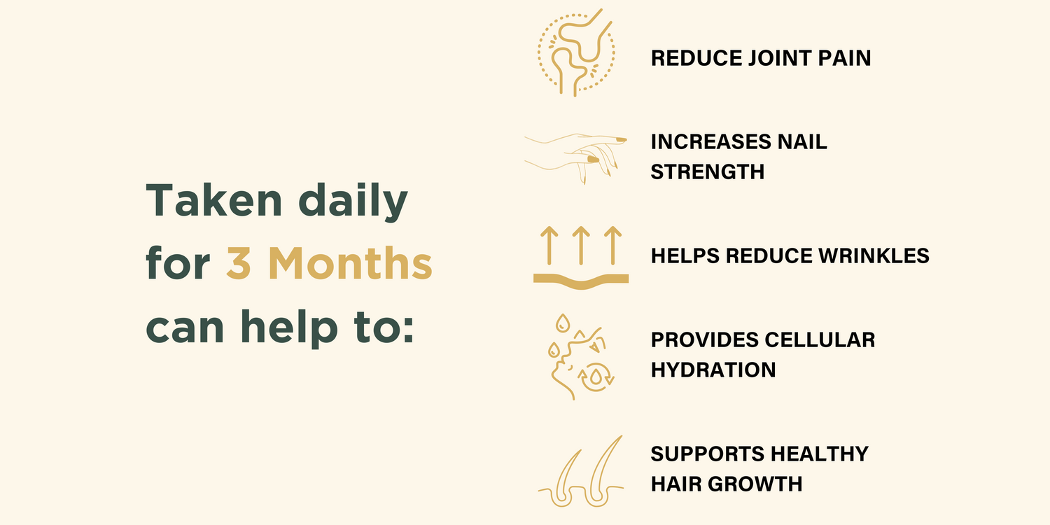 Helps hair growth, strengthens nails, increases skin elasticity, removes fine lines and wrinkles, and improves flexibility of joints.
