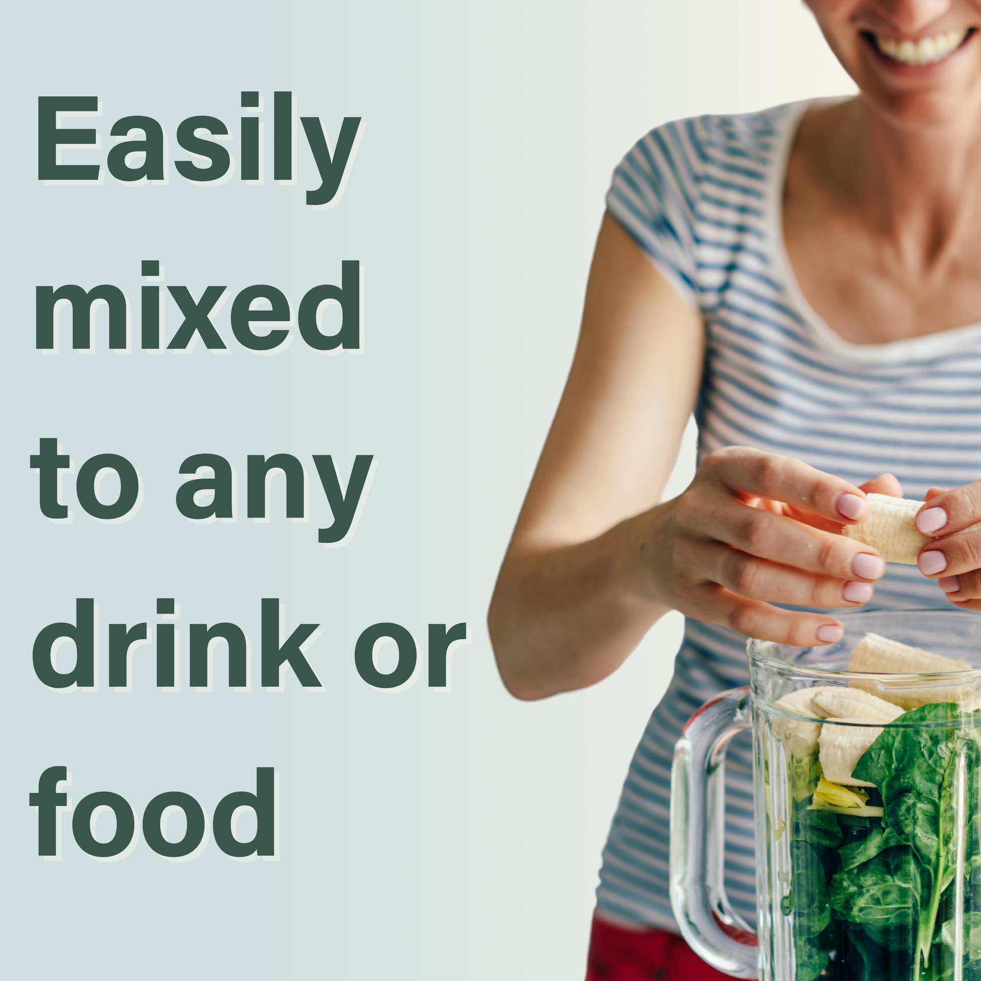 Blends with any hot or cold drinks or food. Blend it with water, coffee, a sports drink, protein shake or even a meal.